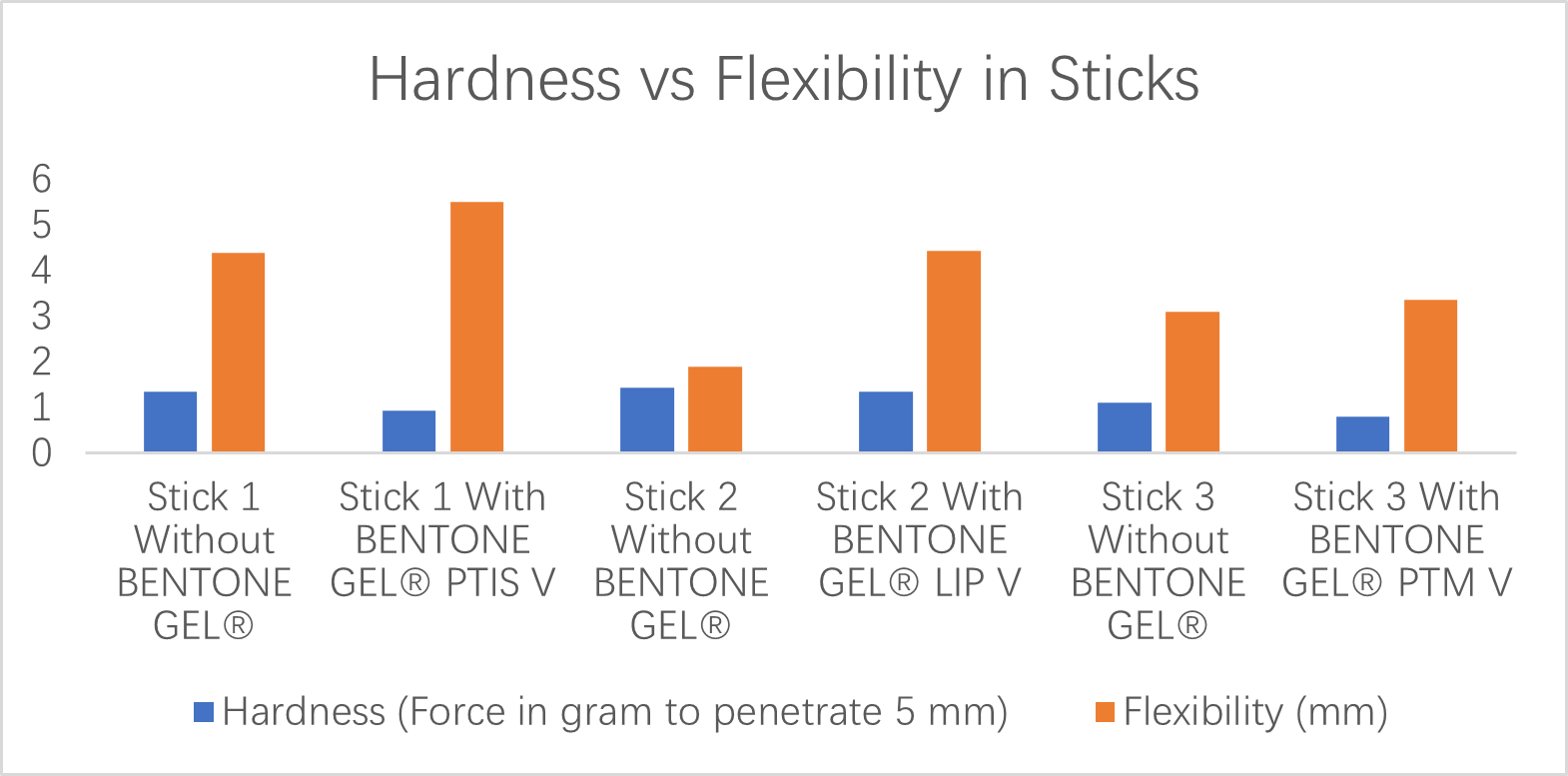 Picture 2: Hardness vs. flexibility in stick formulas with various BENTONE GEL®s