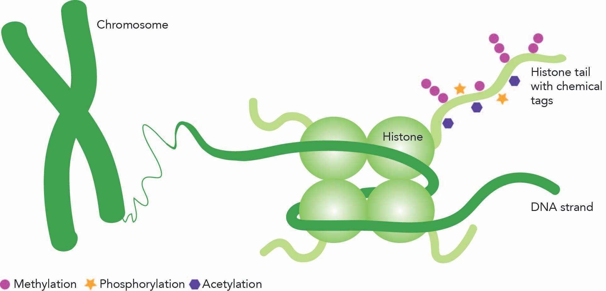 Epigenetics can be explained as being a structure above the genome (epigenetics = “on top of genetics”) that regulates gene expression without changing the DNA code. DNA, which makes each individual unique, holds the instructions for building all of the parts of the body and it is wrapped around proteins that are called histones. The epigenetic regulation works by covering DNA and histones with chemical tags. These marks, which for example include histone methylation, acetylation and phosphorylation, make some genes either readable or not readable without changing the DNA sequence.
