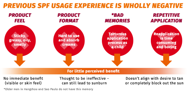 The study findings also revealed that barriers to sunscreen use differ depending on the market, suggesting that sun care product benefits need to be tailored to different regions. For example, French men are interested in tanning and believe that using an SPF product would prevent this. Conversely, young men in China either use products with very high SPF or stay away from the sun because a fair skin complexion is seen as attractive in their culture. Men in the US only associate sun care with the beach and vacations, so feel little need to apply it daily, especially as some think living in an urban area means less exposure to the sun. Similarly, Brazilian men feel that sunscreen is only needed at the beach, but they tend to use products they believe will make immediate, short-term improvements to their appearance.