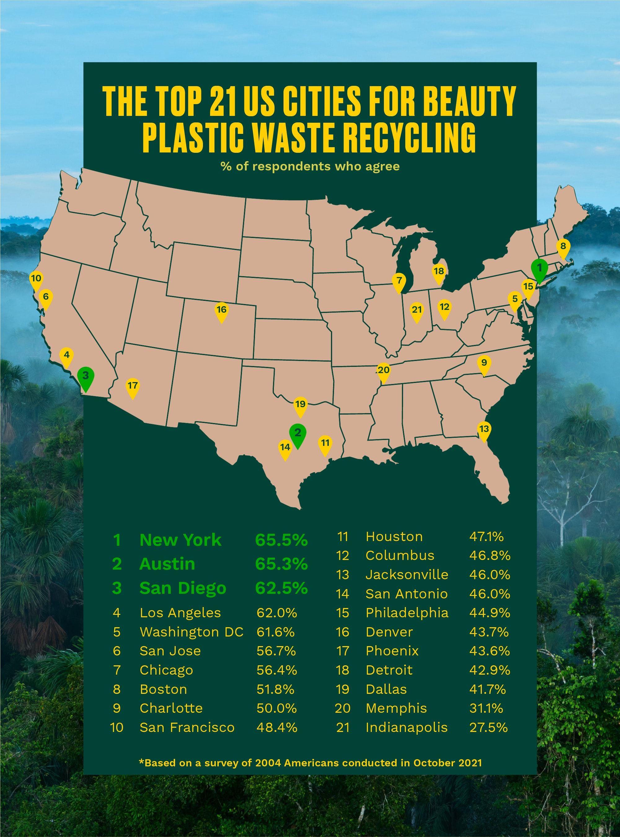 Among the top 21 cities in the US for plastic recycling, the study found a 38-point gap, with New York City leading with 65.5% of survey respondents saying they regularly recycle and Indianapolis leading the rear with 27.5%.